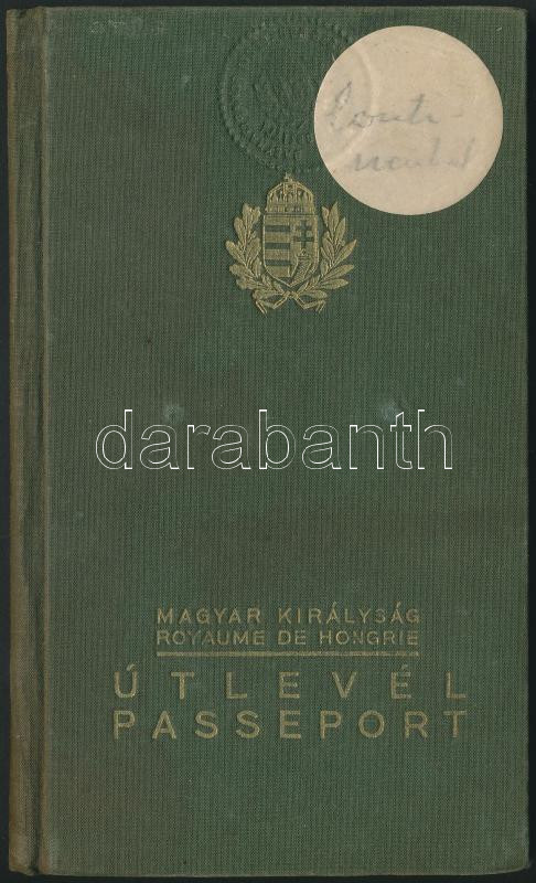 1938 Útlevél, Magyar Királyság, belül foltos, pp.:44, 16x9cm https://www.darabanth.com/de/262-Fernauktion/262.0/Andere-Sammelgebiete/Dokument~36/1938-Utlevel-Magyar-Kiralysag-belul-foltos-pp44-16x9cm~II1298396