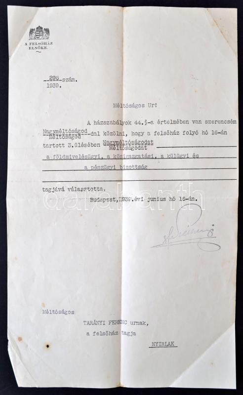 1939 Gróf Széchenyi Bertalan felsőházi elnök értesítése Tarányi Ferenc... https://www.darabanth.com/de/262-Fernauktion/262.0/Andere-Sammelgebiete/Dokument~36/1939-Grof-Szechenyi-Bertalan-felsohazi-elnok-ertesitese-Taranyi-Ferenc-felsohazi-tagnak-b~II1299332