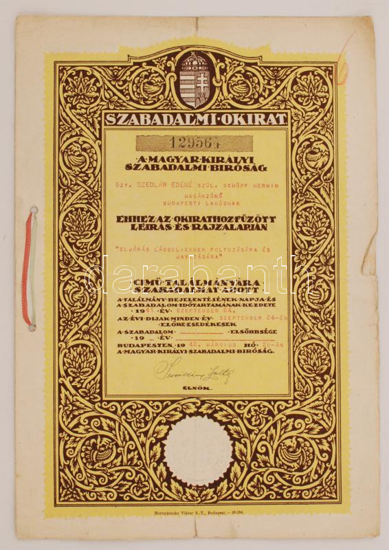 1941 Szabadalmi okirat cipészeti eljárásról, leírással. https://www.darabanth.com/de/262-Fernauktion/262.0/Andere-Sammelgebiete/Dokument~36/1941-Szabadalmi-okirat-cipeszeti-eljarasrol-leirassal~II1279095