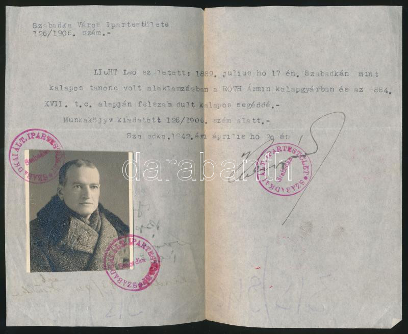 1942 Igazolvány kalapos segéddé nyilvánításról, Szabadka Város Ipartes... https://www.darabanth.com/de/262-Fernauktion/262.0/Andere-Sammelgebiete/Dokument~36/1942-Igazolvany-kalapos-segedde-nyilvanitasrol-Szabadka-Varos-Ipartestulete-arckepes-17~II1303529