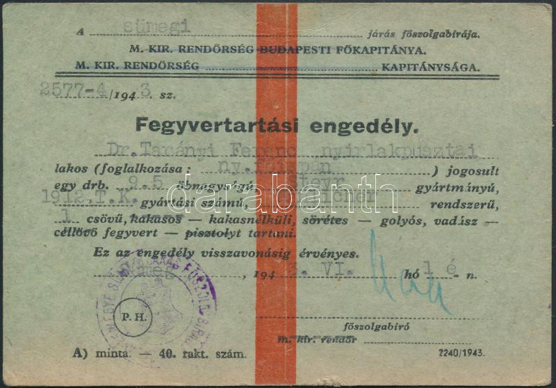 Beschreibung: 1943 Fegyvertartási engedély Tarányi Ferenc főrendiházi tag részére.