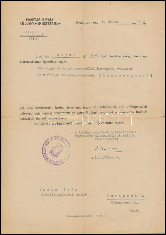 1944 Hivatalos levél a M. Kir. főkonzul aláírásával, 1944-ből, pecsétt... https://www.darabanth.com/de/262-Fernauktion/262.0/Andere-Sammelgebiete/Dokument~36/1944-Hivatalos-level-a-M-Kir-fokonzul-alairasaval-1944-bol-pecsettel~II1278914