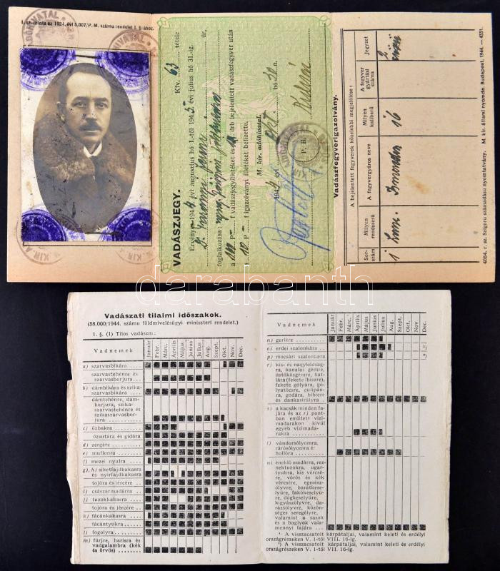 Beschreibung: 1944 Tarányi Ferenc főrendiházi tag fényképes vadászati igazolványa és a vadászati időszakokról szóló nyomtatvány