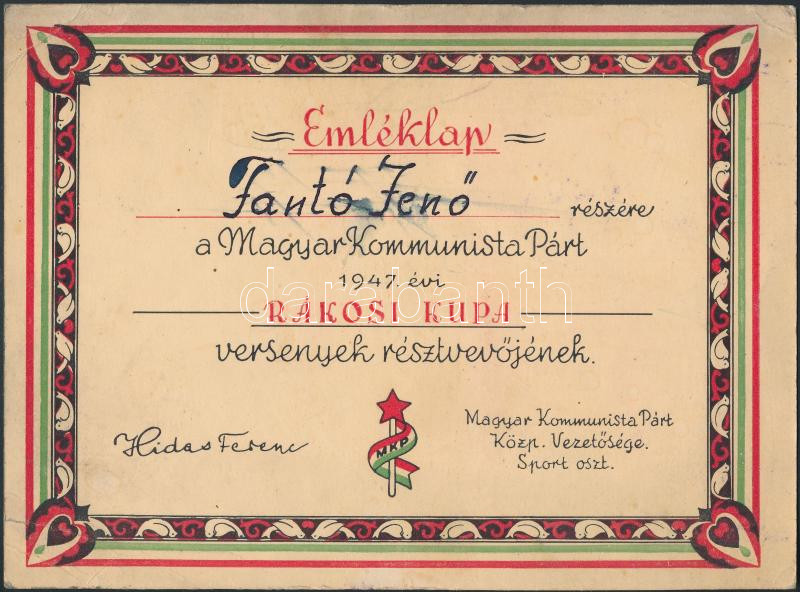 1947 Emléklap a Magyar Kommunista Párt Rákosi Kupa versenyek résztvevő... https://www.darabanth.com/de/262-Fernauktion/262.0/Andere-Sammelgebiete/Dokument~36/1947-Emleklap-a-Magyar-Kommunista-Part-Rakosi-Kupa-versenyek-resztvevojenek~II1301851