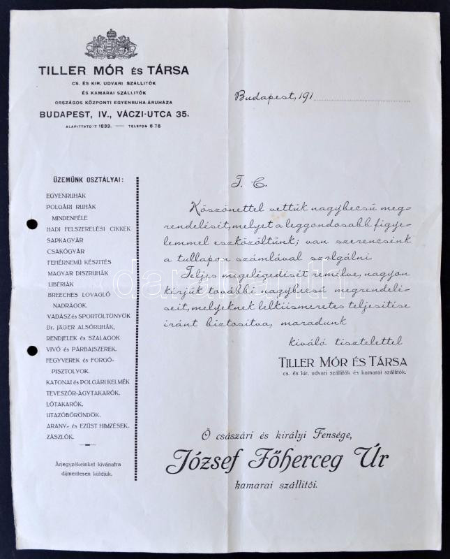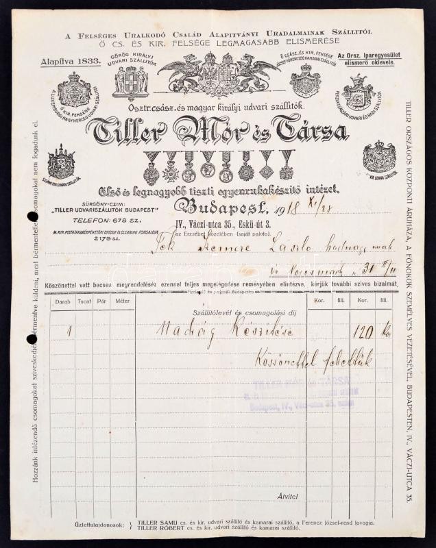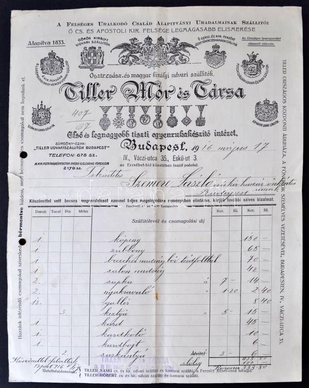 1918 Tiller Mór katonai egyenruha készítő 3 fejléces számla https://www.darabanth.com/de/262-Fernauktion/262.0/Andere-Sammelgebiete/Drucksachen~20/1918-Tiller-Mor-katonai-egyenruha-keszito-3-fejleces-szamla~II1299221