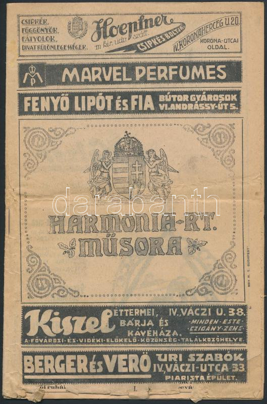 1923 A Harmonia R.T. műsora, hirdetésekkel https://www.darabanth.com/de/262-Fernauktion/262.0/Andere-Sammelgebiete/Drucksachen~20/1923-A-Harmonia-RT-musora-hirdetesekkel~II1303415