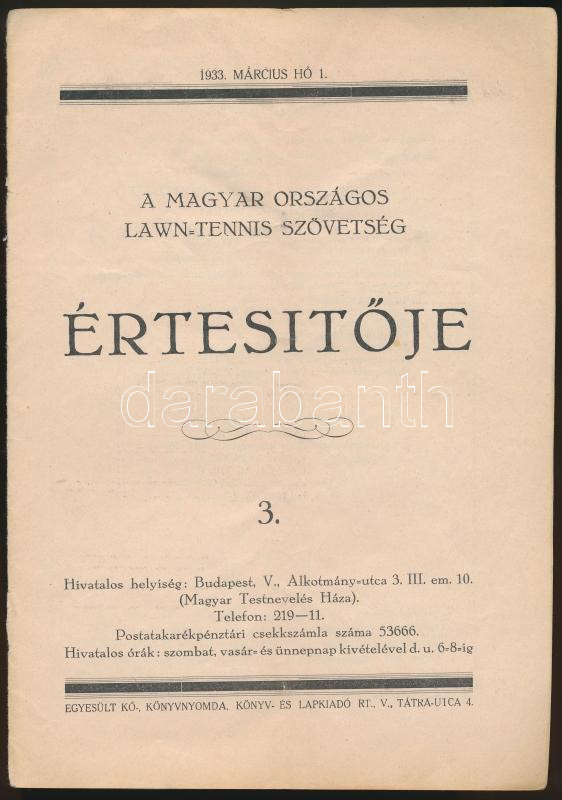 1933 A Magyar Országos Lawn-Tennis Szövetség értesítője, pp.:14, 24x17... https://www.darabanth.com/de/262-Fernauktion/262.0/Andere-Sammelgebiete/Drucksachen~20/1933-A-Magyar-Orszagos-Lawn-Tennis-Szovetseg-ertesitoje-pp14-24x17cm~II1305405