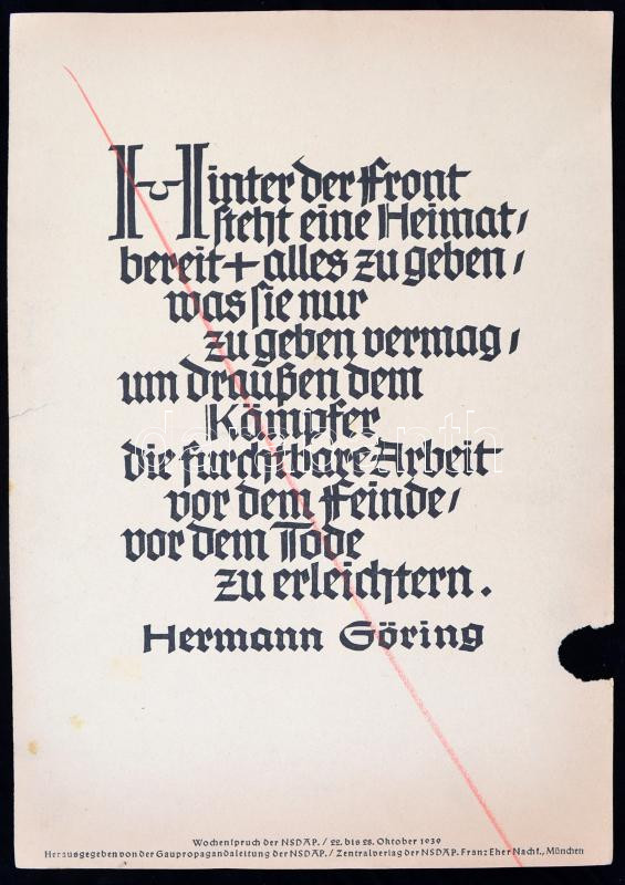 1939 AZ NSDAP heti mottója: Hermann Göringtől származó idézet kisplakáton. A német náci párt 1937-1944 között adott ki motiváló és iránymutató idézeteket. Szakadással / Weekly saying of the NSDAP. from Herman Göring
