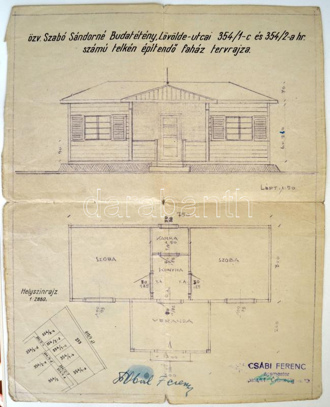 1945 Budatétény, Lövölde utca 354/1c és 354/2a helyrajzi számú telken ... https://www.darabanth.com/de/262-Fernauktion/262.0/Andere-Sammelgebiete/Drucksachen~20/1945-Budateteny-Lovolde-utca-3541c-es-3542a-helyrajzi-szamu-telken-epitendo-fahaz-terv~II1278858