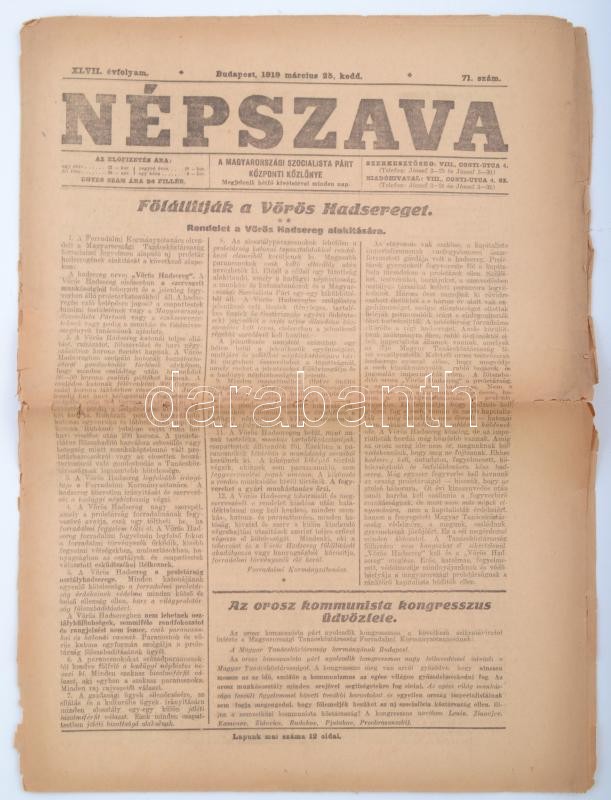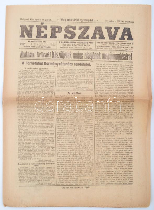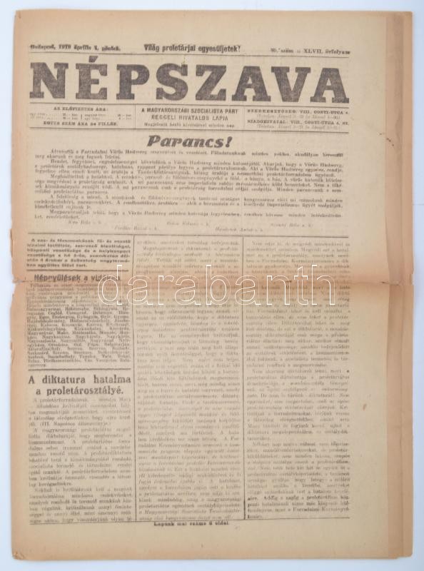 3 db Népszava szám 1919 március-április havából. https://www.darabanth.com/de/262-Fernauktion/262.0/Andere-Sammelgebiete/Drucksachen~20/3-db-Nepszava-szam-1919-marcius-aprilis-havabol~II1262212