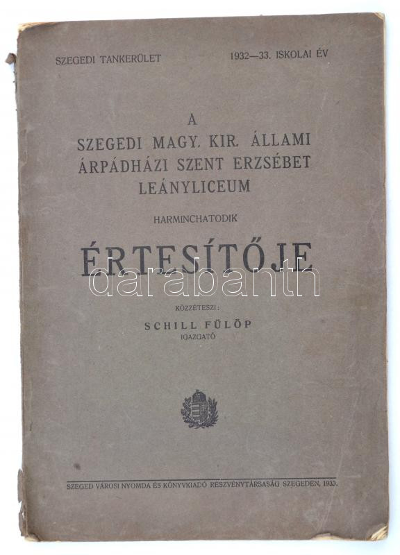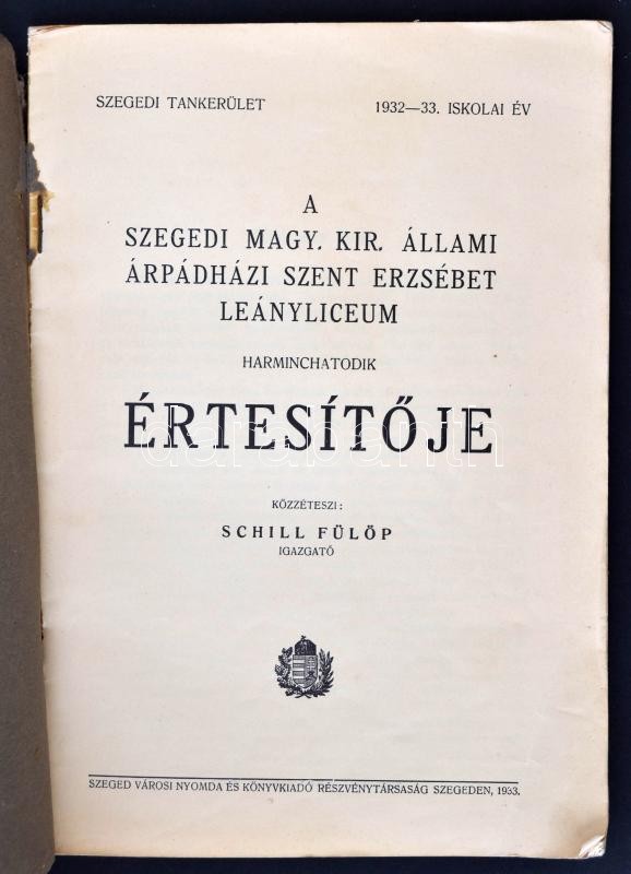 A szegedi magy. kir. állami Árpádházi Szent Erzsébet leánylíceum 36. értesítője 1932-33 iskolai évről. Közzéteszi Schill Fülöp igazgató. Szeged, 1933, Városi Nyomda Rt. 75 p. Kiadói, gerincén kissé sérült papírkötésben.