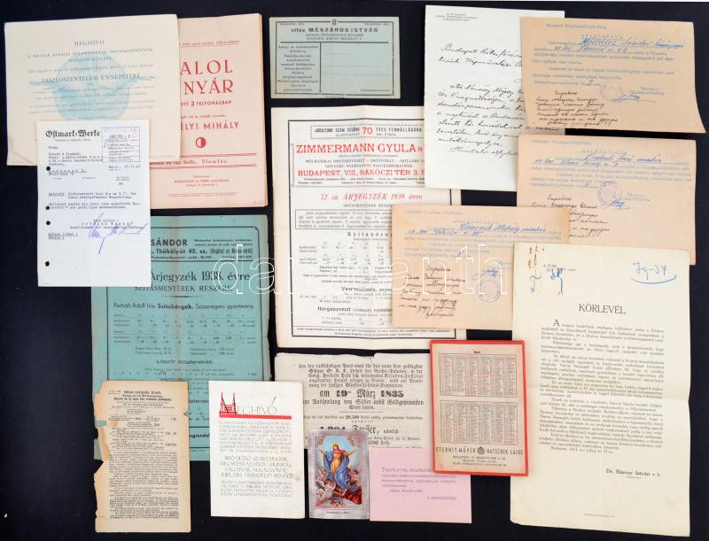 cca 1900-60 Nagyrészt századfordulós nyomtatvány tétel, meghívók, reklámanyagok, árlisták, stb., érdemes megnézni! cca 30db különböző méretben és minőségben