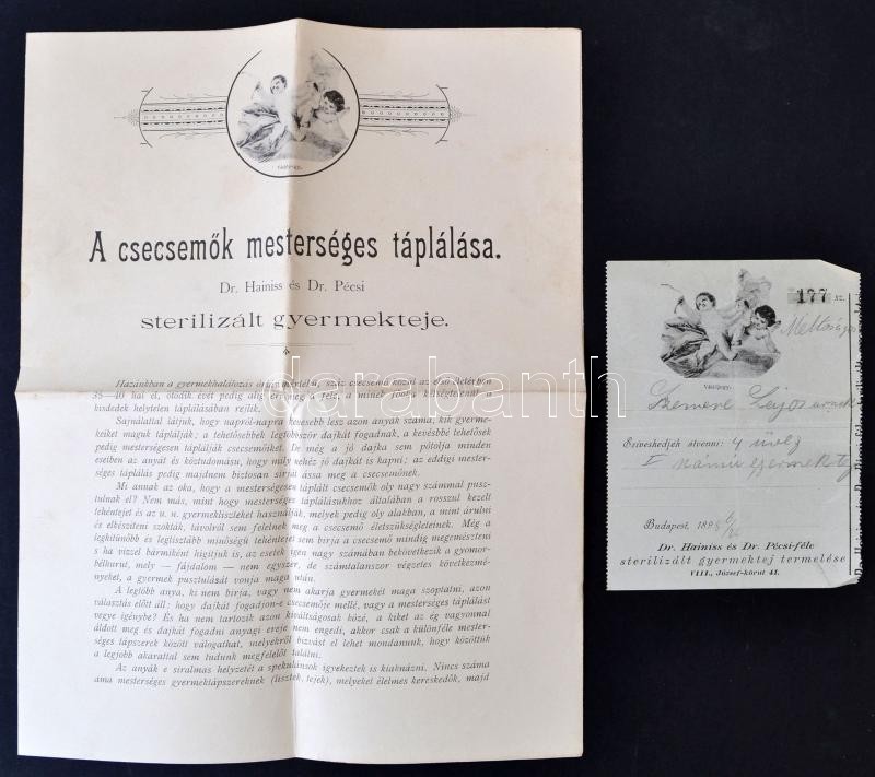 Beschreibung: cca 1900 Haniss és Pécsi sterilizált gyermektejének hirdetése, grafikákkal ellátott reklámlevelei és nyomtatványai