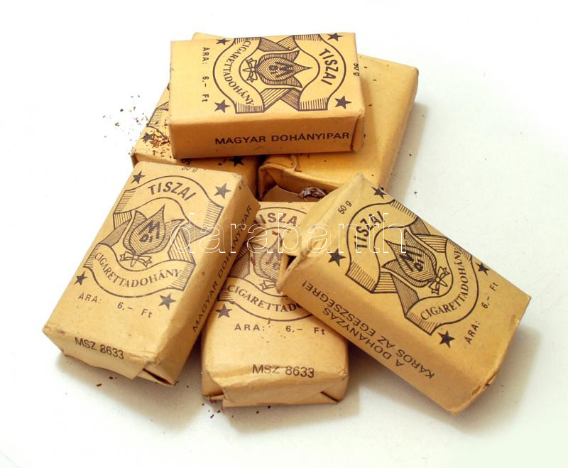 6 csomag Tiszai cigarettadohány https://www.darabanth.com/de/262-Fernauktion/262.0/Andere-Sammelgebiete/Flohmarkt~12/6-csomag-Tiszai-cigarettadohany~II1300135