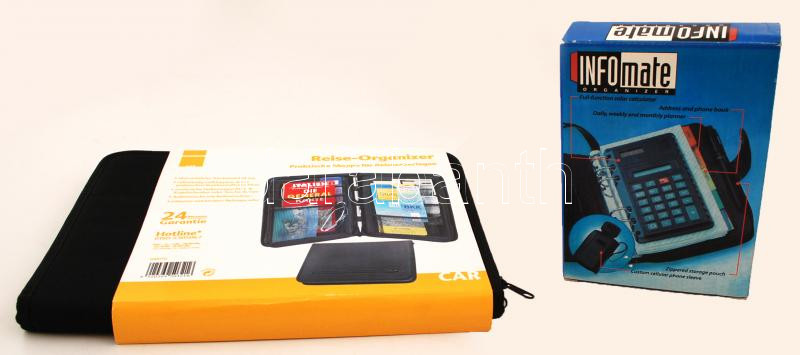 Beschreibung: Nagy méretű irat- és térképtartó utazáshoz, valamint bőrkötéses gyűrűs határidőnapló, benne toll és napelemes számológép.
