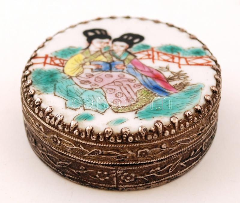 Tükrös fém púderdoboz, Japán motívumos festett porcelánbetéttel. m: 2... https://www.darabanth.com/de/262-Fernauktion/262.0/Andere-Sammelgebiete/Flohmarkt~12/Tukros-fem-puderdoboz-Japan-motivumos-festett-porcelanbetettel-m-2-cm-d-6-cm~II1302850