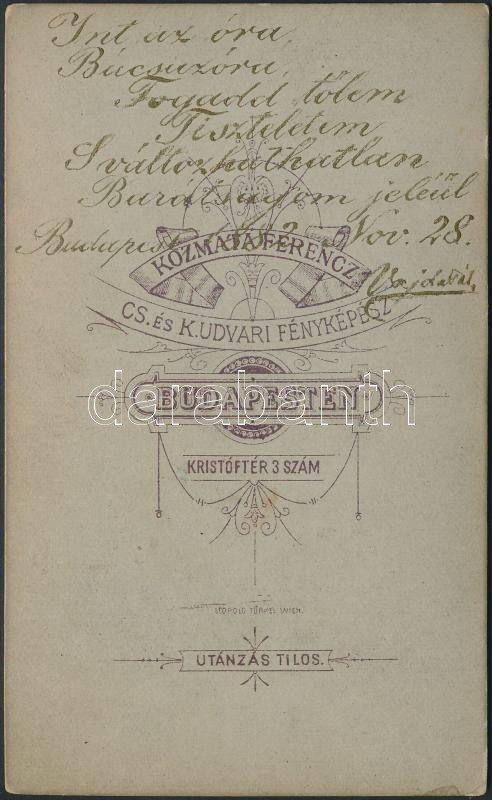 1882 "Mérnök úr" keményhátú fotó "Kozma Ferencz cs. és kir. udvari fényképész Budapesten" jelzéssel, kézírásos hátoldali ajánlással, dátumozással. 6x10 cm.