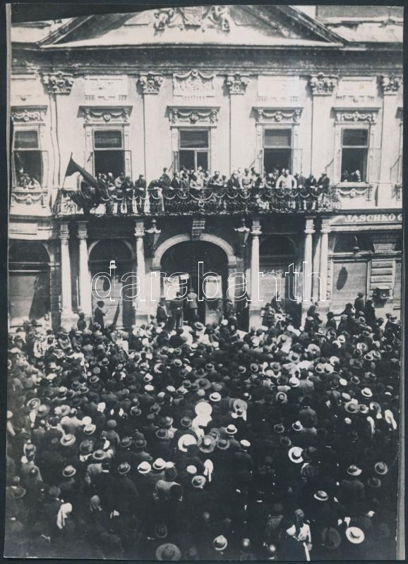 Beschreibung: 1919 Kassa üdvözli a magyar Tanácsköztársaság katonáit. Korabeli fotó nagyítása 16x24 cm
