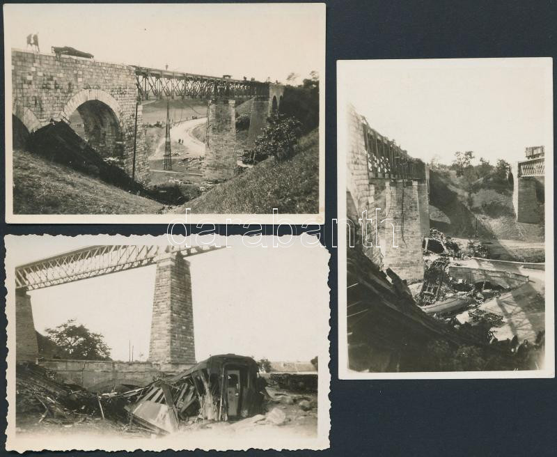 Beschreibung: 1931 A biatorbágyi viadukton felrobbantott gyorsvonat roncsai, 3db fotó verzón feliratozva, 6x9cm