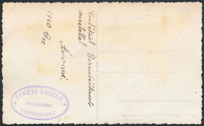 Beschreibung: 1940 Egészalakos portré, fotólap. Hátoldalán "Emlékül Berentééknek" ajánlással,valamint pecséttel "Fekete László fényképész, Veresegyház" 9x14 cm.