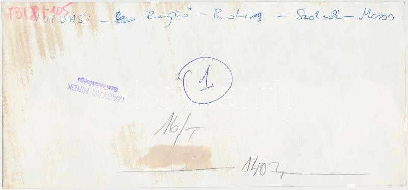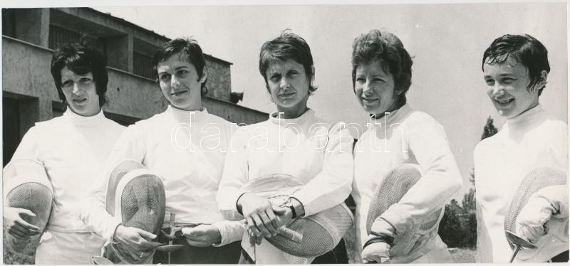 1973 A Göteborgban világbajnok női tőrcsapat. Balról Maros Magda, Szolnoki Mária, Bóbis Ildikó, Rejtő Ildikó, Tordasi Ildikó. A Magyar Hírek felvétele, a hátoldalán pecséttel. 24x11 cm.