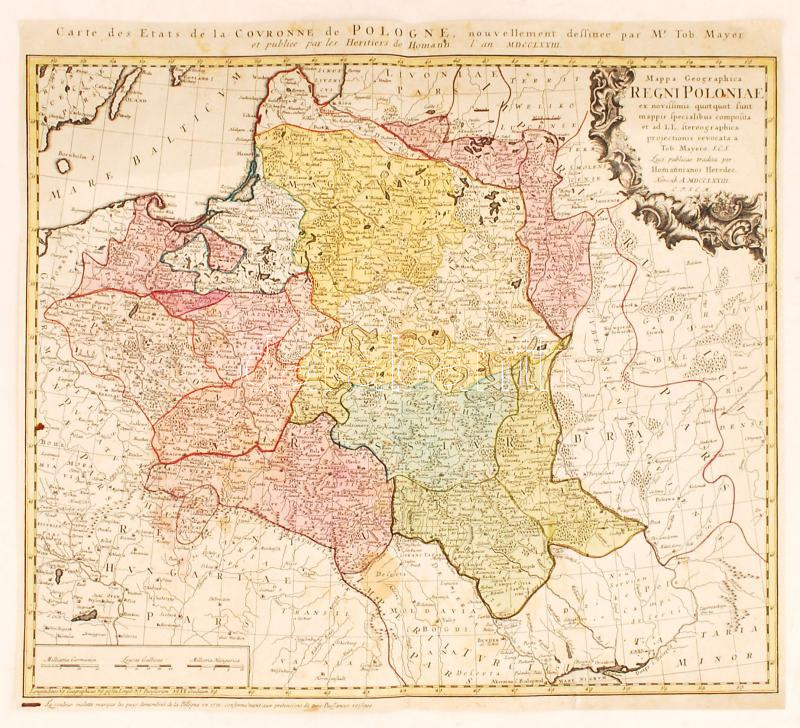 1773 Tobias Mayer; Homann Heirs: Carte des Etats de la couronne de Pologne, map of Poland, Colored etching. 51x47 cm