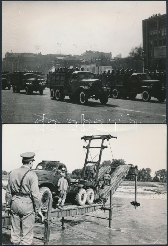 Beschreibung: cca 1950 Járművön vonul a Néphadsereg. 2 db jelzetlen fotó. 18x13,5 cm.