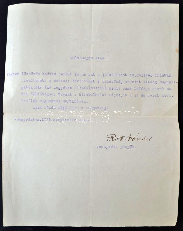 Beschreibung: 1926 Rott Nándor Ferdinánd (1869- 1939) veszprémi püspök aláírt köszönő levele dr. Tarányi Ferenc vasi fősipánnak