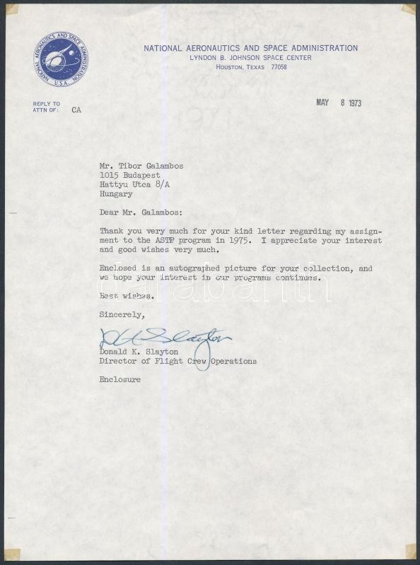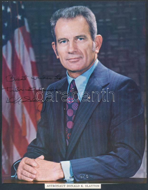 Donald Kent Slayton(ismertebb nevén Deke Slayton) II. világháborús pilóta, ill. egyike NASA Mercury Seven űrhajó személyzetének. - - eredeti aláírása az őt ábrázoló fotón, valamint az általa küldött kísérő levélen. 24,5x19cm