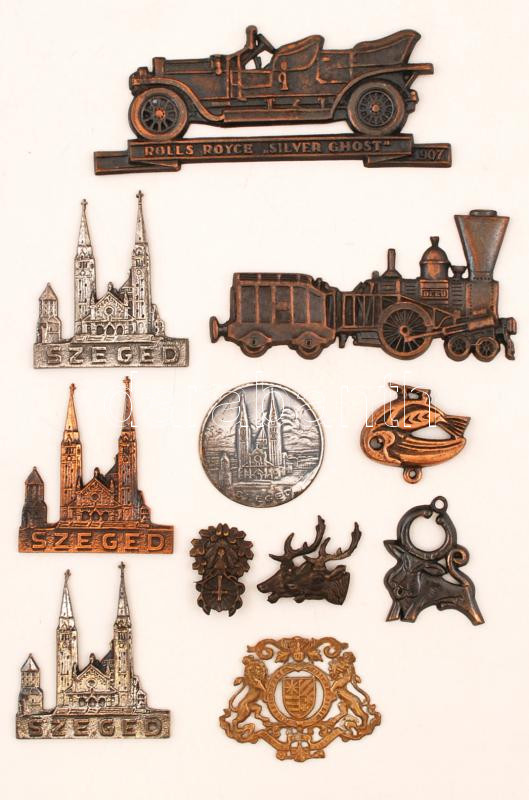 Beschreibung: Vegyes kis réz tétel, rézveretek különféle témákban: Szeged, családi címeres, közlekedési eszközök, vadász. stb., különböző méretben
