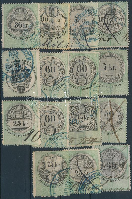 1868 Okmánybélyeg STEMPEL-MARKEN betűs vízjellel (15 db) https://www.darabanth.com/de/262-Fernauktion/262.0/Andere-Sammelgebiete/Stempelmarken~19/1868-Okmanybelyeg-STEMPEL-MARKEN-betus-vizjellel-15-db~II1298891