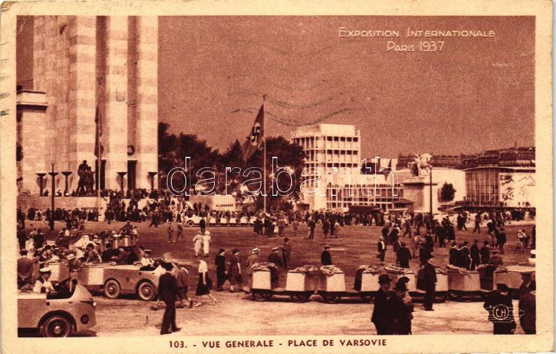 Beschreibung: 1937 Paris, Exposition Internationale, Vue Generale - Place de Varsovie / International Exhibiton, General view - Warsaw square, NS flag (EB)