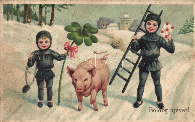 'Boldog újévet' / New Year, chimney sweepers, pig, clover, l... https://www.darabanth.com/de/262-Fernauktion/262.0/Ansichtskarten/GruC39Fkarten-Feste~100103/Boldog-ujevet-New-Year-chimney-sweepers-pig-clover-litho-EK~II1260221