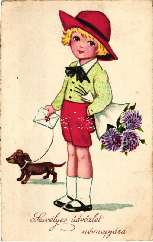 Name day greeting card, girl with dog (EK) https://www.darabanth.com/de/262-Fernauktion/262.0/Ansichtskarten/GruC39Fkarten-Feste~100103/Name-day-greeting-card-girl-with-dog-EK~II1016689