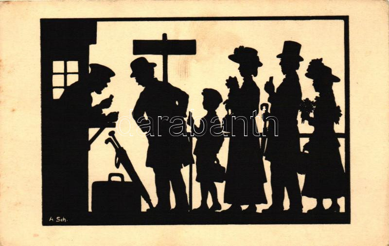 Beschreibung: Bahnsperre / Crowd in a queue, railway barrier, F. A. Ackermann's Kunstverlag Serie 165. Nr. 1945. s: Anna Schirmer (EK)