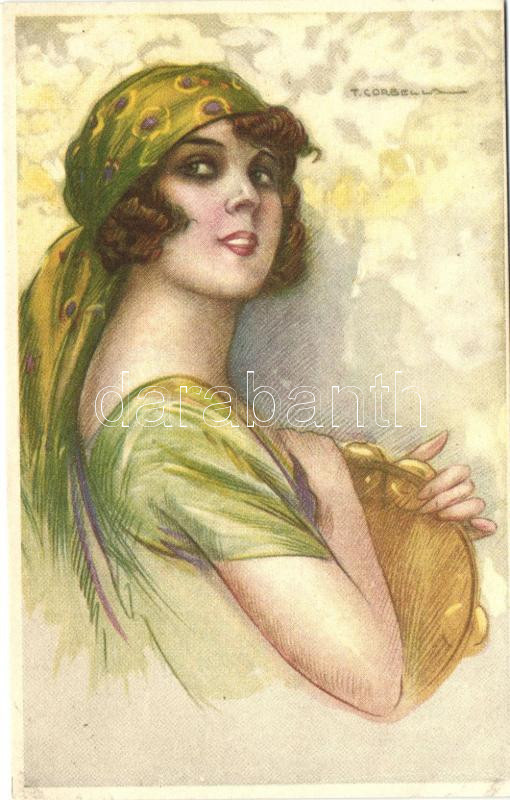 Tambourine girl in green, Degami Serie 626, s: T. Corbella (cut) https://www.darabanth.com/de/262-Fernauktion/262.0/Ansichtskarten/Kunstlerkarten~100091/Tambourine-girl-in-green-Degami-Serie-626-s-T-Corbella-cut~II1303823