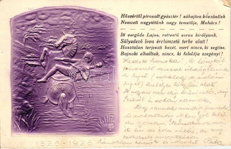 1526-1926 Mohácsi vész 400. évfordulójának emléklaplapja / 400th anniv... https://www.darabanth.com/de/262-Fernauktion/262.0/Ansichtskarten/Militaria~400052/1526-1926-Mohacsi-vesz-400-evfordulojanak-emleklaplapja-400th-anniversary-of-the-Battle-of-~II1267593