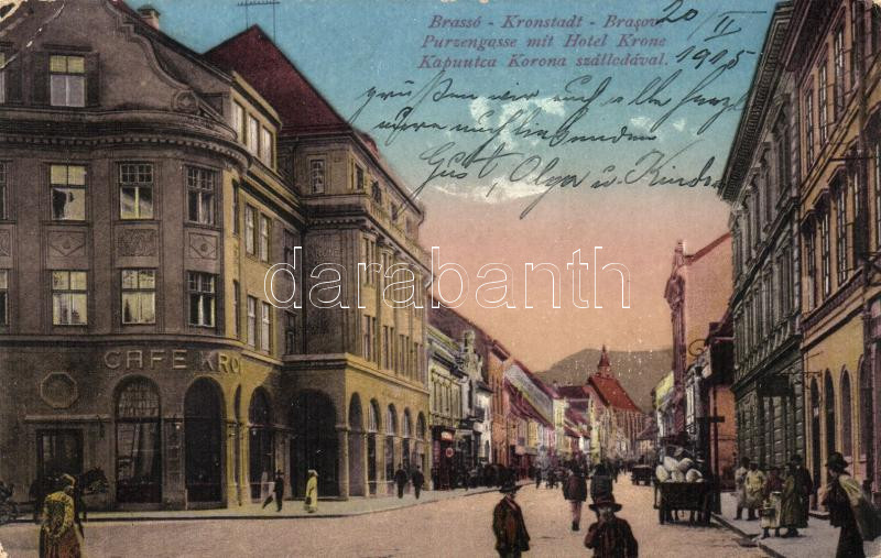 Brassó, Brasov; Kapu utca, Korona Szálloda / street, Hotel Korona (EB) https://www.darabanth.com/de/262-Fernauktion/262.0/Ansichtskarten/Siebenburgen~100025/Brasso-Brasov-Kapu-utca-Korona-Szalloda-street-Hotel-Korona-EB~II1301491