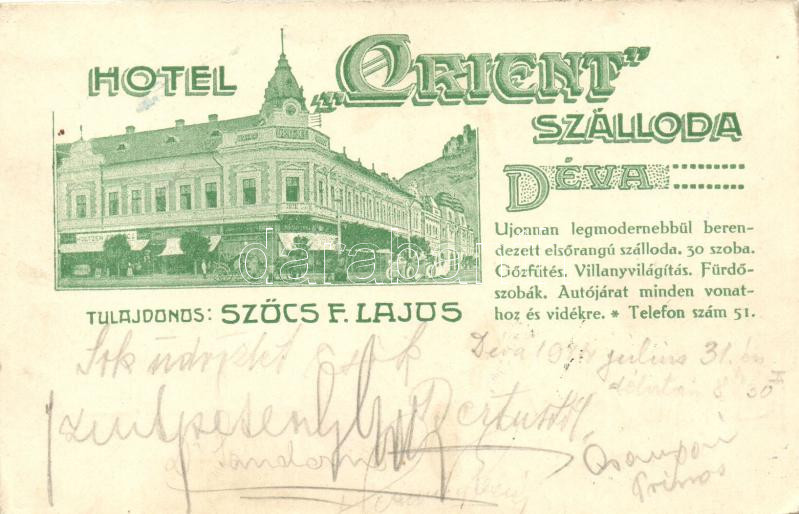 Déva, Orient szálloda / hotel (EK) https://www.darabanth.com/de/262-Fernauktion/262.0/Ansichtskarten/Siebenburgen~100025/Deva-Orient-szalloda-hotel-EK~II1303057
