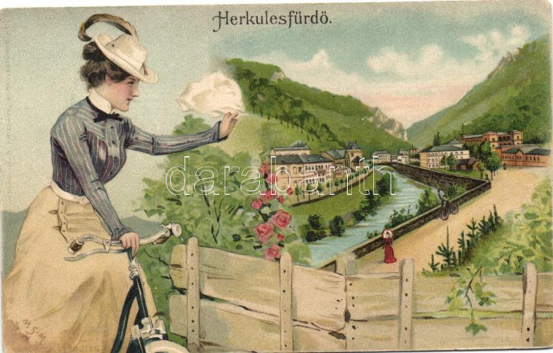 Beschreibung: Herkulesfürdő, Baile Herculane; látkép, hölgy biciklin / general view, Lady on bicycle, litho, s: M.S.M (EK)