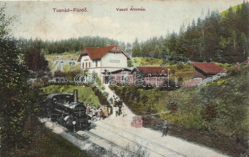 Tusnád-fürdő, vasútállomás, gőzmozdony / railway station, locomotive ... https://www.darabanth.com/de/262-Fernauktion/262.0/Ansichtskarten/Siebenburgen~100025/Tusnad-furdo-vasutallomas-gozmozdony-railway-station-locomotive-azott-sarok-wet-cor~II1263081