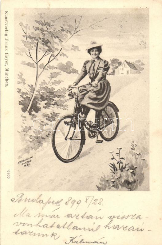1899 Lady on bicycle, Kunstverlag Franz Hayer 6039. s: H. Hildenbrand https://www.darabanth.com/de/262-Fernauktion/262.0/Ansichtskarten/Sport~100097/1899-Lady-on-bicycle-Kunstverlag-Franz-Hayer-6039-s-H-Hildenbrand~II1302313