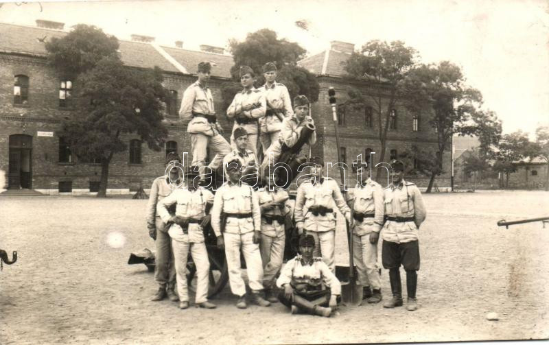 Beschreibung: 1933 Budapest II. Gyalogsági Kadétiskola, karpaszományos (k.p.v.j.) újonc katonák ágyúval, Schäffer photo