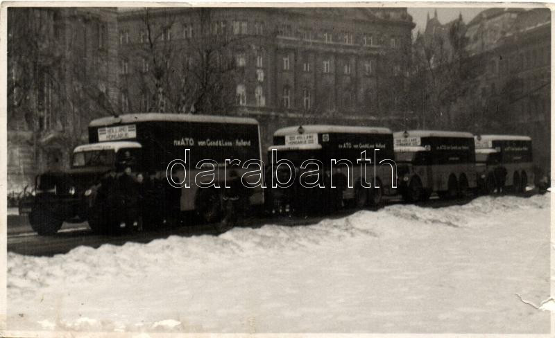 1947 Magyarországra érkezett első kereskedelmi teherautó convoy, mely a Frühling Bernát cég kezdeményezése révén a magyar édesipar ellátására kakaóbabot szállított, photo