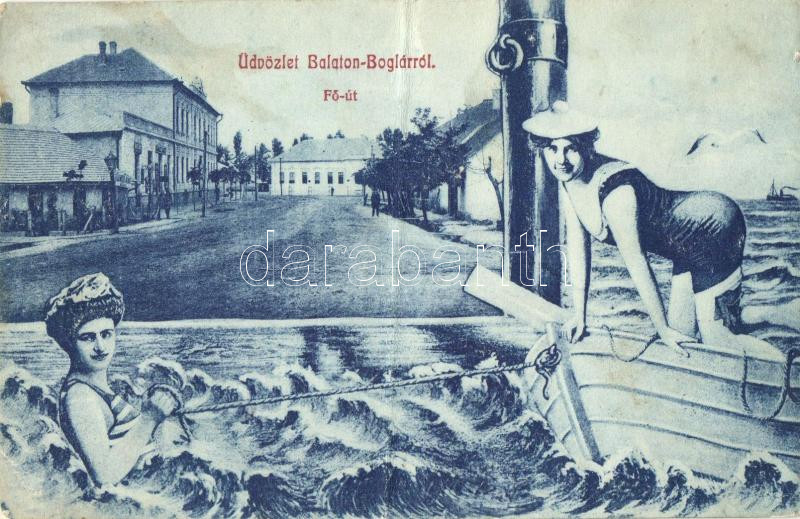 Balatonboglár, Fő út, fürdőző hölgyek (fa) https://www.darabanth.com/de/262-Fernauktion/262.0/Ansichtskarten/Ungarn~100023/Balatonboglar-Fo-ut-furdozo-holgyek-fa~II1301153