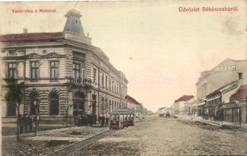 Békéscsaba, Vasút utca, Motor, villamos, Petrányi Gyula bazárja, száll... https://www.darabanth.com/de/262-Fernauktion/262.0/Ansichtskarten/Ungarn~100023/Bekescsaba-Vasut-utca-Motor-villamos-Petranyi-Gyula-bazarja-szalloda-Adler-Lajos-cipesz~II1263074