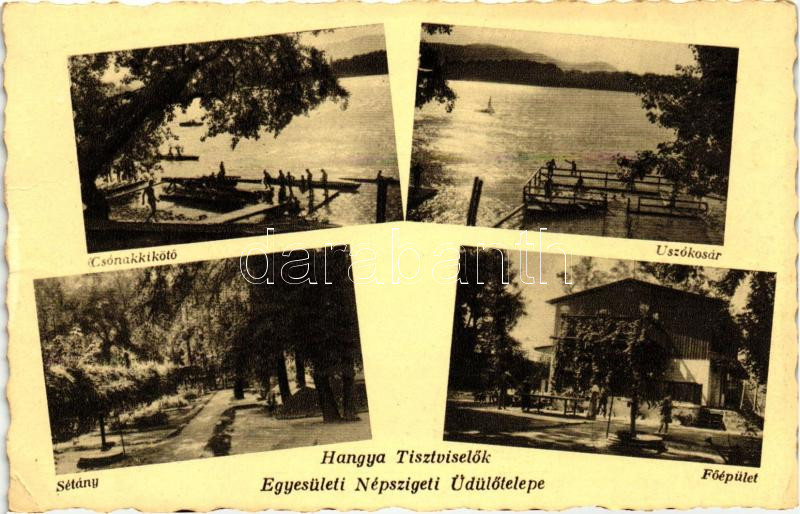 Beschreibung: Budapest IV. Népsziget, Hangya tisztviselők egyesületi üdülőtelepe, úszókosár, főépület, csónak kikötő, sétány, hátoldalon meghívó az Évadnyitó vacsorára (EK)