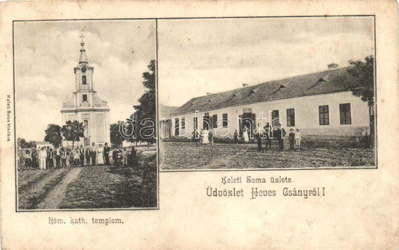 Beschreibung: Csány, Hevescsány; Katolikus templom, Keleti Soma üzlete; saját kiadása