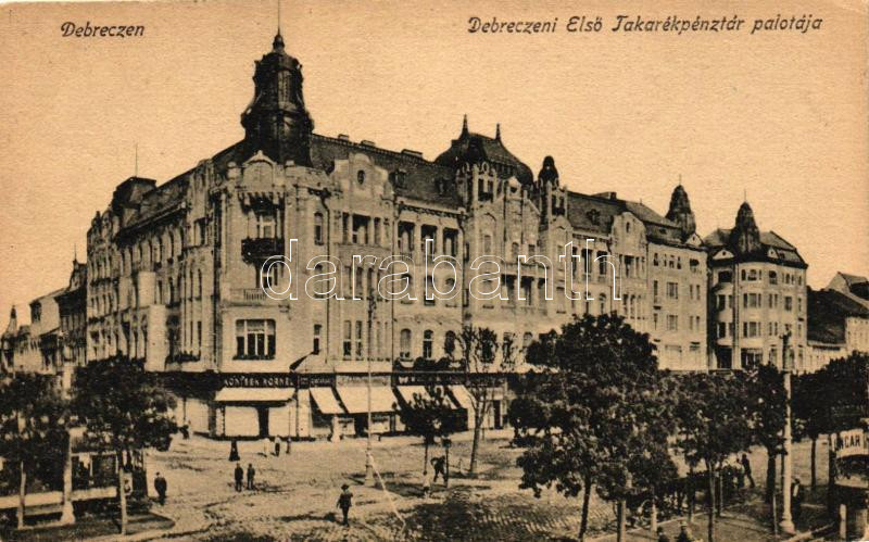 Debrecen, Első Takarékpénztár palotája, Kontsek Kornél üzlete (EK) https://www.darabanth.com/de/262-Fernauktion/262.0/Ansichtskarten/Ungarn~100023/Debrecen-Elso-Takarekpenztar-palotaja-Kontsek-Kornel-uzlete-EK~II1301375