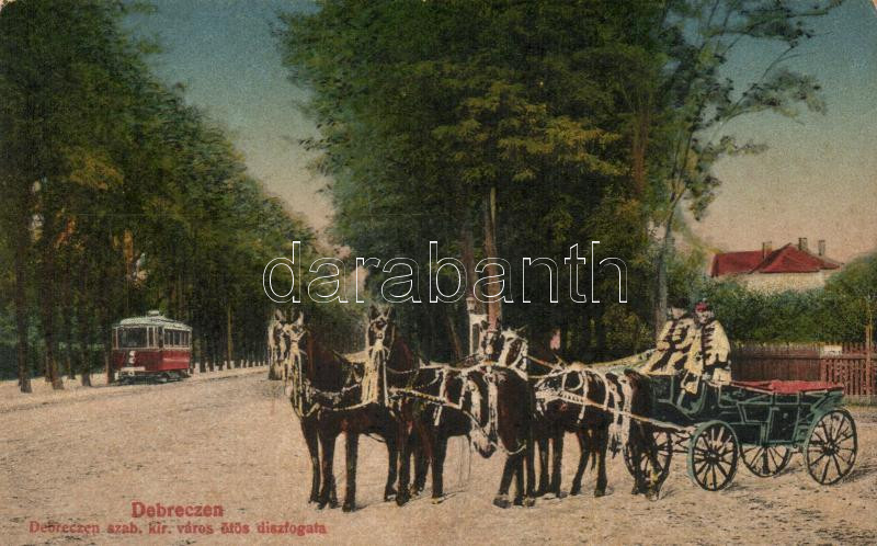 Beschreibung: Debrecen, Szabad királyi város ötös díszfogata, villamos